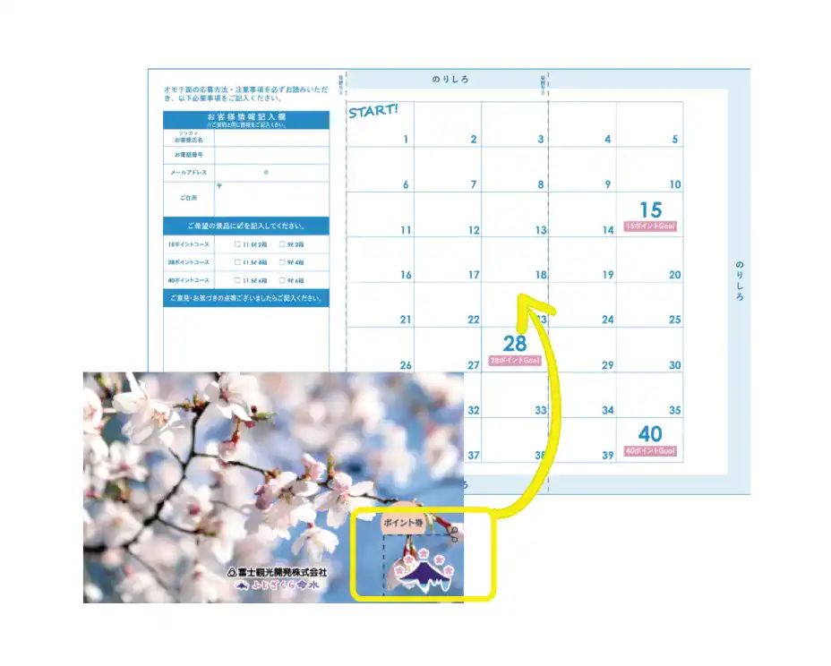 定期配送の天然水に同封されている「ふじざくら通信」の表紙からポイント券を切り取り、専用の応募用紙に貼ってください。