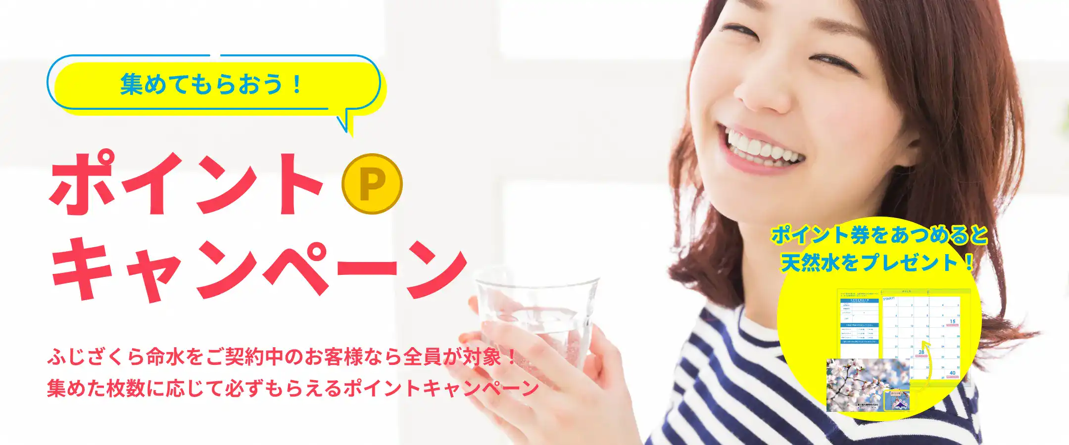 ふじざくら命水をご契約中のお客様全員を対象に、集めた枚数に応じて必ずもらえるポイントキャンペーンを実施中です!