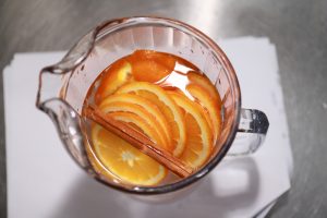 2. ピッチャーにふじざくら命水とオレンジ、シナモンスティックをいれます。