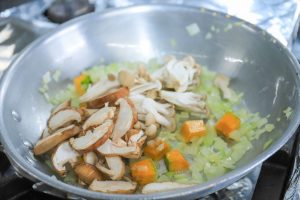2. かぼちゃの角切りとスライスした生椎茸、ほぐしたブナシメジを加えて炒めます。