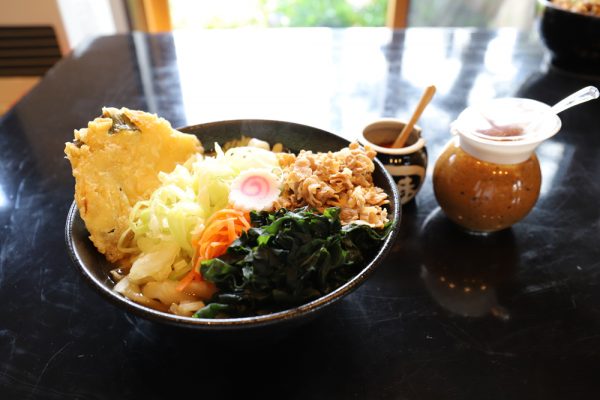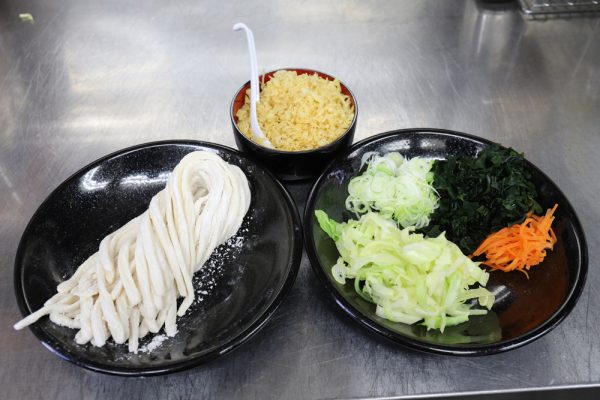 3. あらかじめ準備した茹で野菜などをのせ、スープをかけます。ネギと天かすをのせて完成です。撮影協力:ふじ山食堂