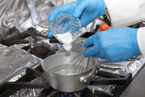 2. ふじざくら命水とアガー、グラニュー糖を泡だて器で少しずつ混ぜます。