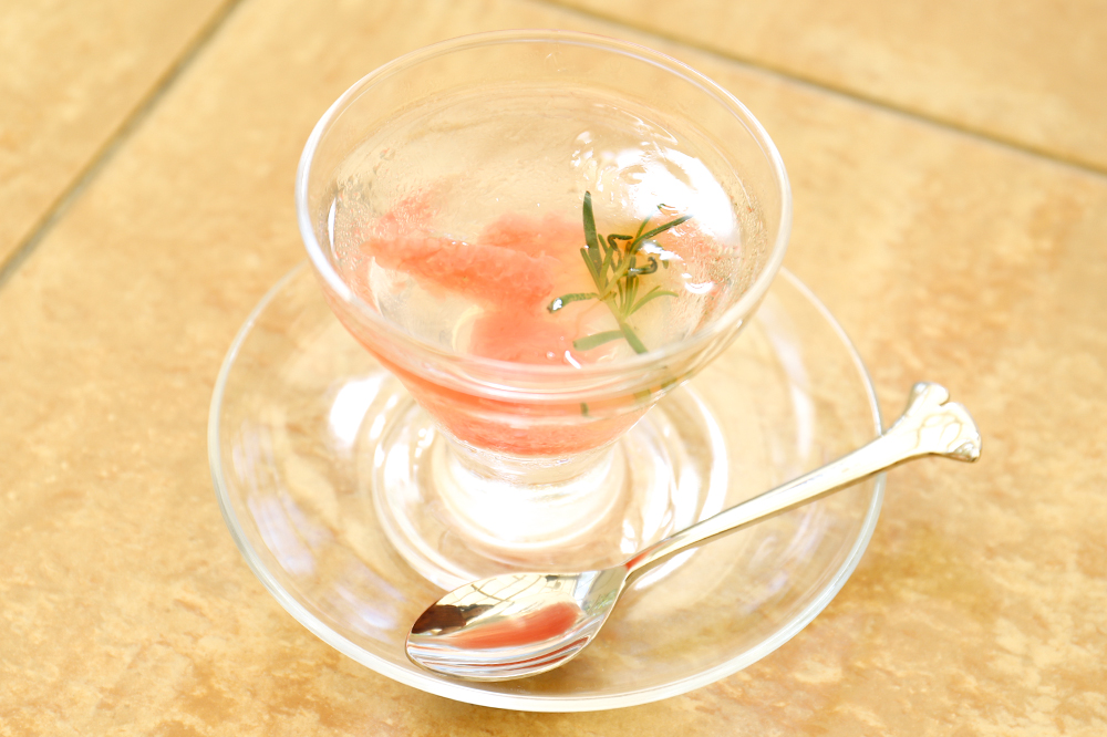 4. グレープフルーツ、ローズマリーと一緒に器に流し、冷蔵庫で冷やしたら完成です。