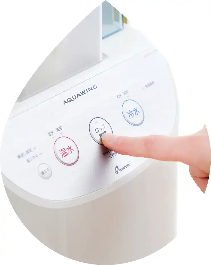 電気ポットと同じ「ロック解除」ボタンと「温水または冷水」ボタンを押すだけで簡単に注水できます。