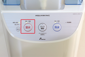 ウォーターサーバーの電源を入れると、操作パネルの「温水」ボタンがオレンジに点滅します。「温水」ボタンを3秒長押しすると緑の点灯に変わり、温水ヒーターがONになります。